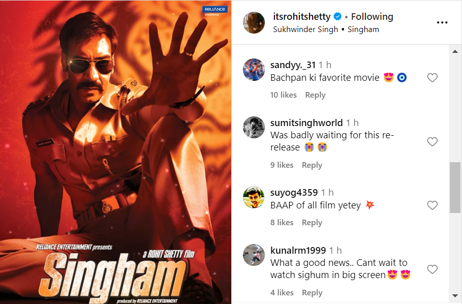 निर्देशक ने लिखा, “दिवाली पर अपनी पूरी ताकत के साथ उसके आने से पहले! उसकी ताकत को फिर से अनुभव करें। सिंघम अगेन से पहले दोबारा सिंघम देखें! 18 अक्टूबर को सिनेमाघरों में दोबारा रिलीज हो रही है।”