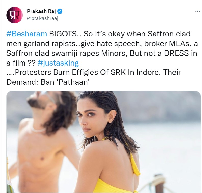 Prakash Raj Supports Deepika Padukone Over Besharam Rang Saffron Bikini Controversy दीपिका पादुकोण फिल्म पठान के गाने बेशरम रंग में भगवा बिकिनी पहनने को लेकर ट्रोल हो रही हैं। अब अभिनेत्री को एक्टर प्रकाश राज ने सपोर्ट किया है।
