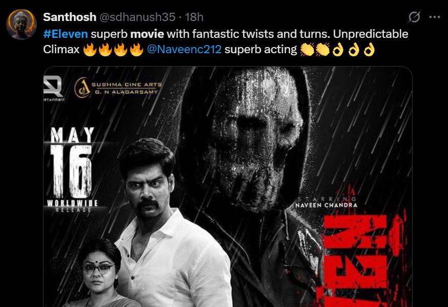 नवीन चंद्र स्टारर साउथ फिल्म इलेवन को रिलीज के बाद से ही अच्छे रिव्यू मिल रहे हैं। इस फिल्म को IMDb ने 9.8 रेटिंग दी है, जबकि सोशल मीडिया यूजर्स भी इसे अच्छा रिव्यू दे रहे हैं। एक यूजर ने एक्स हैंडल पर लिखा, "शानदार ट्विस्ट एंड टर्न के साथ इलेवन सुपर्ब मूवी। क्लाइमेक्स से ऐसी उम्मीद नहीं थी। नवीन चंद्र बढिया एक्टिंग।"