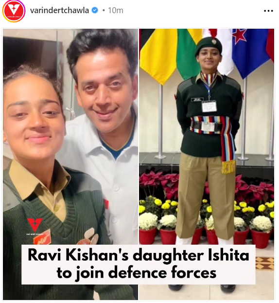 सेलिब्रिटी फोटोग्राफर वरिंदर चावला ने अपने इंस्टाग्राम पर एक पोस्ट शेयर किया है, जिसके कैप्शन में लिखा, भोजपुरी अभिनेता #रविकिशन की 21 साल की बेटी इशिता शुक्ला अग्निपथ योजना के तहत रक्षा बल में शामिल होंगी। कुछ दिनों पहले उनके सेना में शामिल होने की खबरें आ रहीं थी।