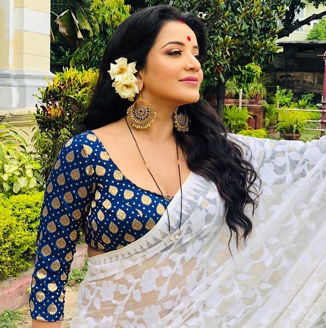 वहीं एक दूसरे फोटो में उन्होंने वाइट रंग की साड़ी पहन रखी है और ब्लू कलर का ब्लाउज पहन रखा हैl इसमें उन्होंने बालों में फूल भी लगा रखा हैl