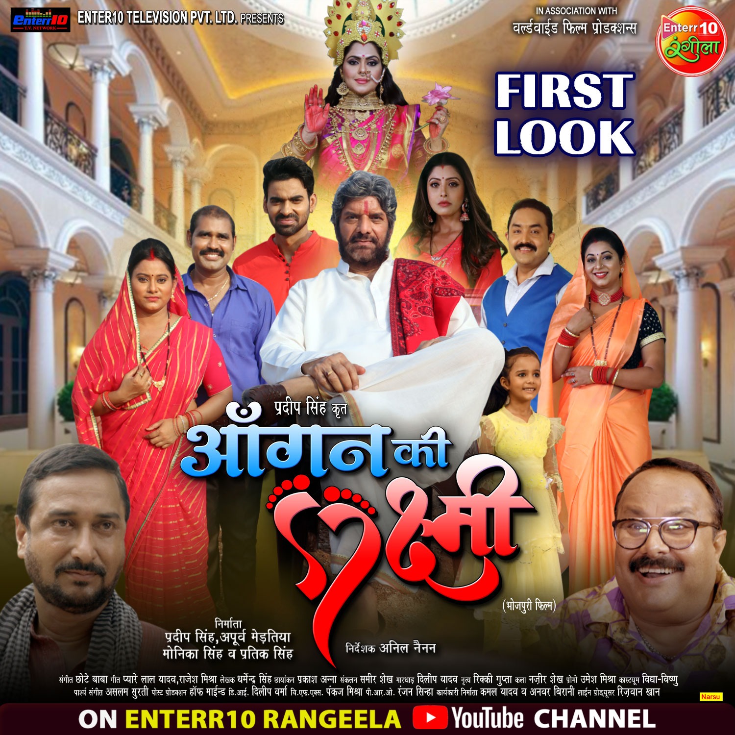 नई दिल्ली, जेएनएन। वर्ल्ड वाइड फिल्म प्रोडक्शन और प्रदीप सिंह द्वारा निर्मित भोजपुरी फिल्म 'आँगन की लक्ष्मी' का फर्स्ट लुक आउट हो गया है। यह फिल्म धार्मिक और पारिवारिक है, जिसका फर्स्ट लुक बेहद भव्य नजर आ रहा है। इंटर 10 टेलीविजन प्रा. लि. प्रस्तुत फिल्म 'आँगन की लक्ष्मी' के निर्माता प्रदीप सिंह, अपूर्व मेड़तिया, मोनिका सिंह और प्रतीक सिंह हैं। इस फिल्म के निर्देशक अनिल नैनन हैं। फिल्म 'आँगन की लक्ष्मी' का निर्माण व्यापक पैमाने पर हुआ है। ये कहना है प्रदीप सिंह का। उन्होंने कहा कि फिल्म 'आँगन की लक्ष्मी' भोजपुरी की सर्वश्रेष्ठ फिल्मों में से एक होगी। इस फिल्म में इंडस्ट्री के सितारों का हुजूम देखने को मिलेगा। ये सब फिल्म की कहानी की डिमांड है। सबों ने इस फिल्म के लिए खूब मेहनत की है, तब जाकर एक शानदार फिल्म लेकर आज हम तैयार हैं।