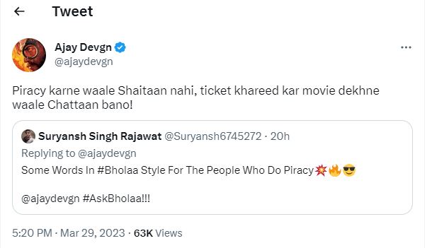 अजय देवगन ने फैंस के साथ इस मजेदार बातचीत के अलावा उनके कुछ सीरियस सवालों के भी सीधे-सीधे जवाब दिए। अजय देवगन से एक फैन ने ट्विटर पर पूछा, 'भोला के अंदाज में आप उन लोगों को कुछ कहना चाहेंगे, जो पायरेसी करते हैं'।