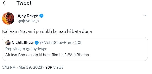 #ASKBHOLAA के इसी सवाल-जवाब सेशन में एक फैन ने अजय देवगन से ये भी पूछ लिया कि 'रिलीज से एक दिन पहले , क्या करते हो सर'। इस सवाल का जवाब देते हुए अजय देवगन ने कहा, 'वही, जो कर रहा हूं'।