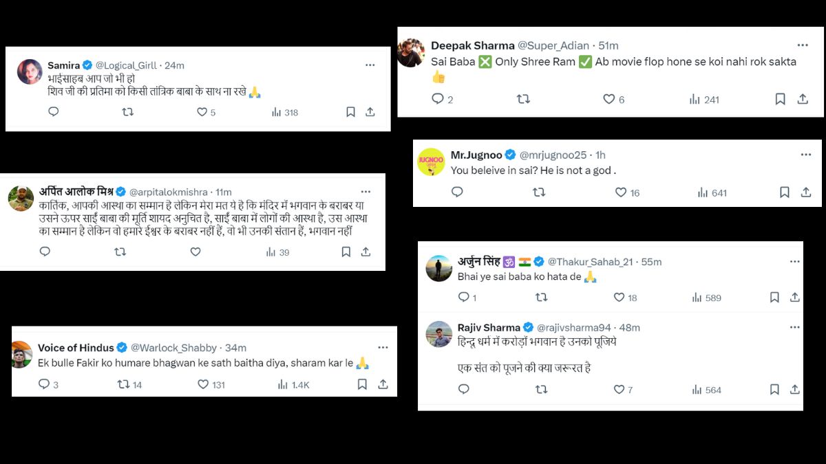 कार्तिक के इस ट्वीट पर एक यूजर ने कमेंट कर लिखा है- भाई साईं बाबा की मूर्ती को हटा दिया है। दूसरे ने कमेंट किया है- कार्तिक, आपकी आस्था का सम्मान है लेकिन मेरा मत ये है कि मंदिर में भगवान के बराबर या उसने ऊपर साईं बाबा की मूर्ति शायद अनुचित है, साईं बाबा में लोगों की आस्था है, उस आस्था का सम्मान है लेकिन वो हमारे ईश्वर के बराबर नहीं हैं, वो भी उनकी संतान हैं, भगवान नहीं।