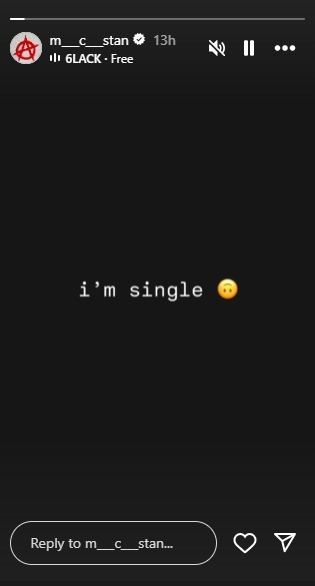बता दें कि एमसी स्टैन सोशल मीडिया पर काफी ज्यादा एक्टिव हैं और इससे पहले भी वो डिप्रेशन, अकेलापन और मौत को लेकर ऐसा कुछ पोस्ट कर चुके हैं जिसने उनके फैंस को चिंता में डाल दिया था। अब उन्होंने हाल ही में एक स्टोरी शेयर की है जिसमें उन्होंने लिखा- 'मैं सिंगल हूं'। इससे फैंस ये अंदाजा लगा रहे हैं कि उनका ब्रेकअप हो चुका है।