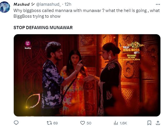 एक यूजर ने लिखा, "मुनव्वर आपकी जनता आपको ऐसे टूटते हुए नहीं देख सकती है"। दूसरे यूजर ने लिखा, "बिग बॉस ने मनारा को मुनव्वर के साथ क्यों बुलाया? ये सब क्या चल रहा है, बिग बॉस दिखाने की क्या कोशिश कर रहे हैं"।