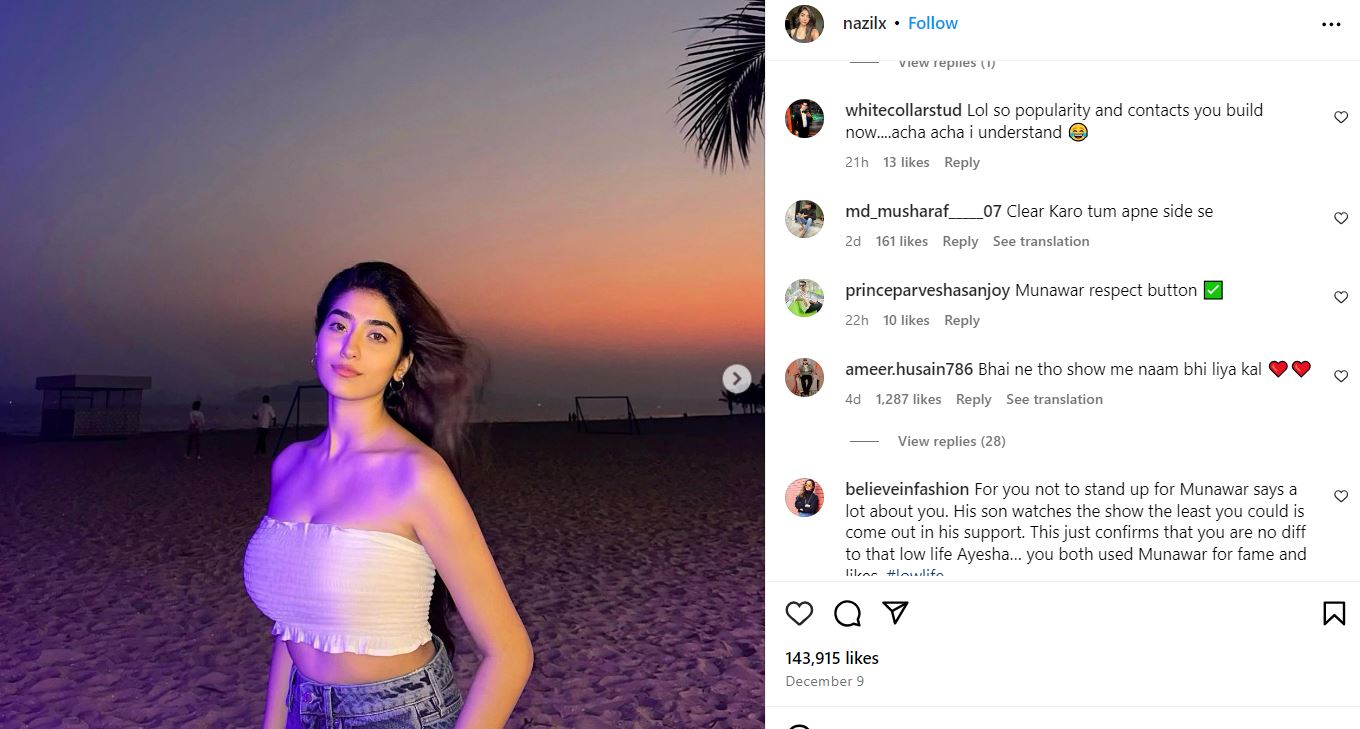 नाजिला सिताशी सोशल मीडिया पर आए दिन अपनी किसी न किसी पोस्ट को लेकर चर्चा में आ ही जाती है। कुछ दिनों पहले उन्होंने अपना इंस्टाग्राम अकाउंट डिएक्टिवेट कर दिया था, लेकिन एक बार फिर वह सोशल मीडिया पर लौट आई हैं। नाजिला के इंस्टाग्राम पर कमबैक करते ही यूजर्स इस बता पर भड़के कि नाजिला बिग बॉस 17 के कंटेस्टेंट मुनव्वर फारुकी कि एक्स गर्लफ्रेंड को क्यों फॉलो कर रही हैं।