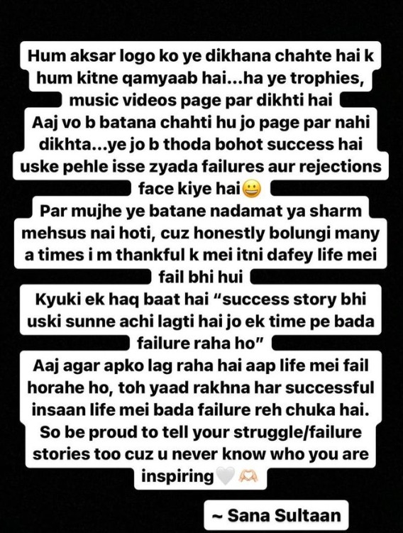 पोस्ट शेयर करते हुए सना ने लिखा, सक्सेस स्टोरी भी उन्हीं की सुनने में अच्छी लगती है जो एक टाइम पर बड़ा फेल्योर रहा हो। सना के इस पोस्ट से साफ झलक रहा है कि वो जीवन की असफलताओं के बारे में बात कर रही हैं जिसके बारे में कोई जल्दी नहीं बोलता। हर कोई स्टार के अवॉर्ड्स और उसकी कामयाबी की ही चर्चा करता है।