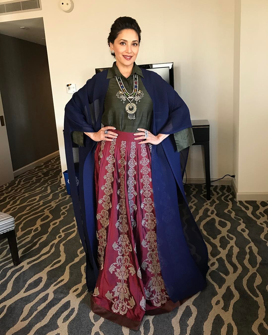 इंडियन और वेस्टर्न स्टाइल का यह कॉम्बिनेशन भी माधुरी पर खूब जंच रहा है। मैरून एम्ब्रोइडेड लहंगा, ग्रीन टॉप, डार्क- ब्लू दुपट्टा और उसे कैरी करने का स्टाइल वाकी काफ़ी इम्प्रेसिव है। देतीं है ना माधुरी अपनी उम्र को मात?