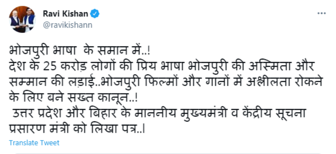 Actor and Gorakhpur MP Ravi Kishan writes to Union Information Minister Prakash Javadekar and UP CM Yogi Adityanath, seeking a strict law to curb vulgar content in Bhojpuri cinema