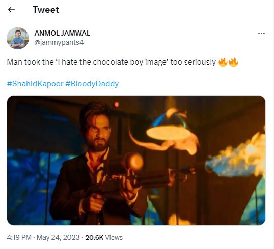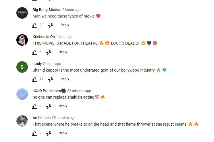 एक अन्य यूजर ने लिखा, "आग ही आग शाहिद कपूर फायर है"। उनकी एक्टिंग की तारीफ करते हुए लोग थक नहीं रहे हैं"।