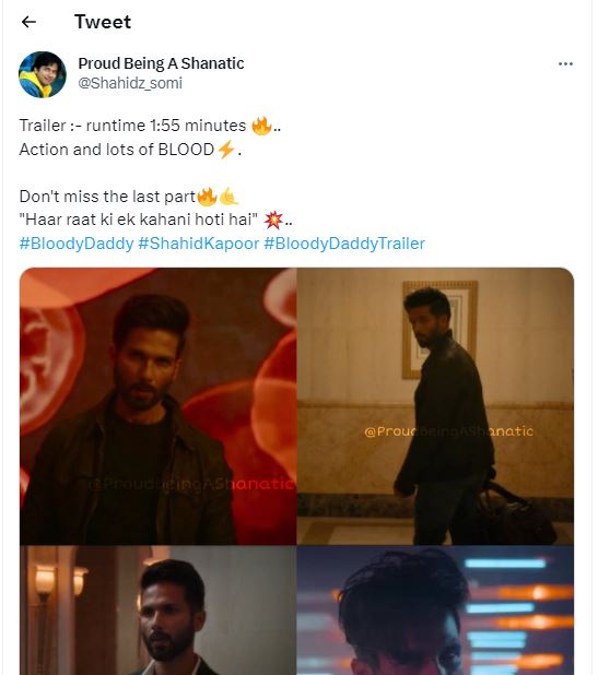 सोशल मीडिया पर लोग 'ब्लडी डैडी' के ट्रेलर पर जबरदस्त प्यार बरसा रहे हैं। कुछ यूजर्स का तो ये भी कहना है कि शाहिद कपूर की इस फिल्म को ओटीटी पर नहीं, बल्कि थिएटर में रिलीज करना चाहिए"।