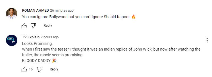 दूसरे यूजर ने लिखा, "ये ट्रेलर बहुत ही प्रॉमिसिंग है, जब मैंने पहली बार फिल्म का टीजर देखना था, तो मुझे लगा था कि हॉलीवुड फिल्म जॉन विक को दोहराया जा रहा है, लेकिन फिल्म के ट्रेलर को देखने के बाद बहुत ही अच्छा लग रहा है, ब्लडी डैडी"।