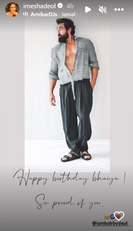 एशा देओल ने इंस्टाग्राम स्टोरी पर भैया बॉबी देओल की एक स्टनिंग तस्वीर शेयर की है। ओपन शर्ट में बॉबी अपनी धांसू बॉडी फ्लॉन्ट कर रहे हैं। तस्वीर के साथ एशा ने कैप्शन में लिखा, "जन्मदिन मुबारक हो भैया। आप पर बहुत गर्व है।" नजरबट्टू, हार्ट और स्माइली के साथ एशा ने भाई बॉबी को टैग भी किया है।