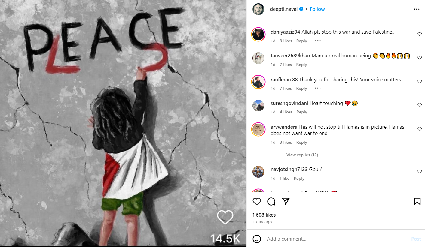 एक्ट्रेस के इस पोस्ट पर कई यूजर्स कमेंट कर रहे हैं। एक ने किया, "कृपया इस युद्ध को रोकें और फिलिस्तीन को बचाएं।" एक अन्य यूजर ने लिखा, "मैम, आप असली इंसान हैं।" तीसरे यूजर ने लिखा, "दुनिया को शांति की सख्त जरूरत है।