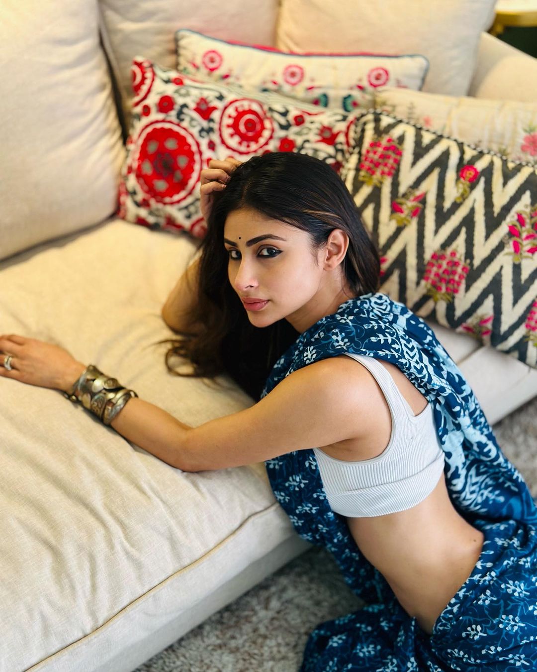 इन फोटोज में मौनी रॉय ब्लू कलर की व्हाइट प्रिंट वाली साड़ी पहने नजर आ रही हैं। इस साड़ी को उन्होंने व्हाइट ब्लाउज के साथ वियर किया है। मौनी ने कई तस्वीरें शेयर की हैं, जिनमें वो एक से बढ़कर एक पोज देते हुए दिखाई दे रही हैं। कुछ फोटो में वो जमीन पर बैठ कर अपनी पतली कमर फ्लॉन्ट कर रही हैं, तो कुछ में सोफे पर लेट कर अदाएं दिखा रही हैं।