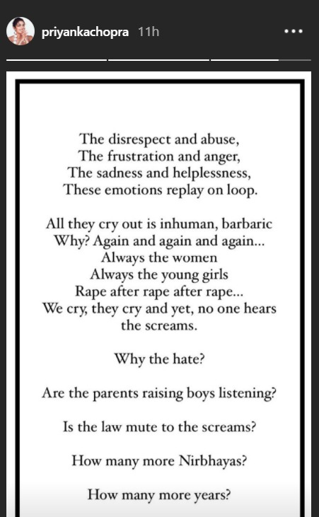प्रियंका चोपड़ा ने इस घटना को लेकर एक भावुक पोस्ट अपनी इंस्टाग्राम स्टोरी में लिखी- ''अनादर और गालियां। झुंझलाहट और गुस्सा। दु:ख और बेबसी। यह भावनाएं बार-बार आ रही हैं। बार-बार ऐसा क्यों हो रहा है। हमेशा औरतें, हमेशा बच्चियां... दुष्कर्म के बाद दुष्कर्म... हम चिल्लाते हैं, वो चिल्लाते हैं... फिर भी चीखें कोई नहीं सुनता। इतनी नफ़रत क्यों है।''