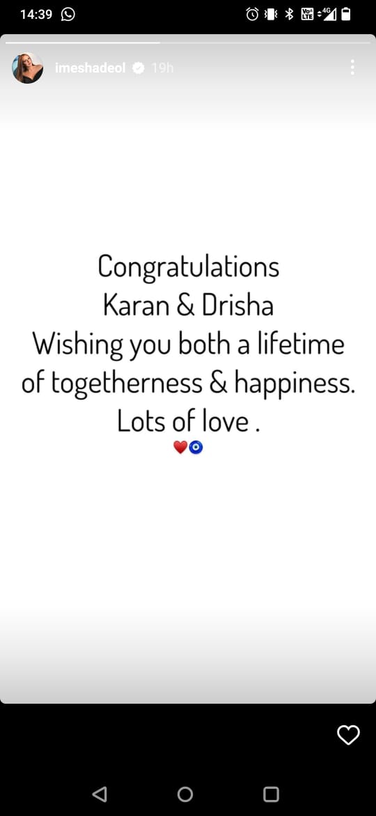 करण की शादी को लेकर कहा जा रहा है था कि हेमा परिवार सहित शादी में शिरकत करेंगी, हालांकि ऐसा कुछ नहीं हुआ। इस बीच अब हेमा की बड़ी बेटी ईशा देओल ने इंस्टाग्राम स्टोरी पर एक पोस्ट साझा किया है, जिसमे लिखा,‘करण और द्रिशा को बधाई, आप दोनों को जिंदगी भर का साथ और ढ़ेर सारी खुशियां मिले, बहुत सारा प्यार।’ बुआ ईशा की तरफ से दी गई बधाई सोशल मीडिया पर सुर्खियां बन गई है।