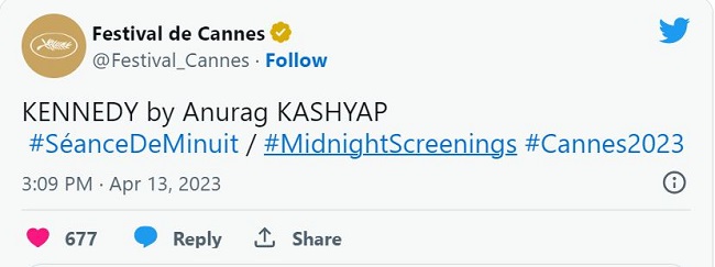 इस लिस्ट में एकमात्र भारतीय फिल्म अनुराग कश्यप की है। इस फिल्म का नाम कैनेडी है और यह मिडनाइट स्क्रीन सेक्शन के लिए चयनित की गई है। कांस फिल्म फेस्टिवल 16 मई से 27 मई तक होने वाला है। कांस फिल्म फेस्टिवल के आधिकारिक ट्विटर हैंडल ने इस बात की जानकारी दी है। उन्होंने लिखा है, 'अनुराग कश्यप की कैनेडी का चुनाव किया गया है।' कैनेडी में राहुल भट्ट और सनी लियोनी के अलावा अभिलाष थपलियाल की अहम भूमिका है।