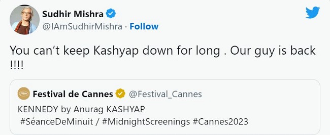 Cannes 2023 Anurag Kashyap Kennedy कांस फिल्म फेस्टिवल में अनुराग कश्यप की फिल्म कैनेडी दिखाई जाएगी। यह एकमात्र फिल्म होगी। जिसकी स्क्रीनिंग की जाएगी। इसे लेकर सुधीर मिश्रा काफी उत्साहित है और उन्होंने इसकी प्रशंसा भी की है।