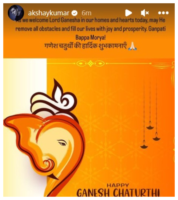 अक्षय कुमार को गणेश उत्सव बहुत पसंद है। खिलाड़ी कुमार ने गणपति की एक तस्वीर शेयर करते हुए लिखा, 'आज हम अपने दिल और घर में गणेश भगवान का स्वागत कर रहे हैं। प्रार्थना है कि सारी मुसीबतें निकाल कर वह हमारी जिंदगी को खुशियों और उन्नति से भर दें। गणपति बप्पा मोर्या। गणेश चतुर्थी ही हार्दिक शुभकामनाएं।'