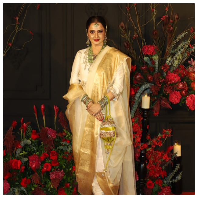 सोनाक्षी सिन्हा के वेडिंग रिसेप्शन में रेखा भी शामिल हुईं। उन्होंने अपनी सादगी और खूबसूरती से वेडिंद रिसेप्शन में लाइमलाइट बढ़ा दी। दिग्गज एक्ट्रेस रेखा ने इस बार साड़ी की जगह सूट में खुद को कैरी किया। ग्रीन ज्वेलरी, रेड लिपस्टिक और लाइट मेकअप से उन्होंने अपने लुक को पूरा किया।