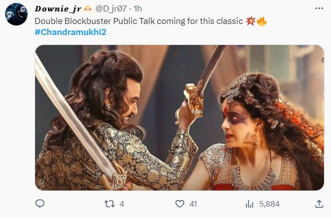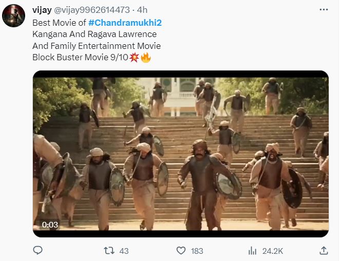 अन्य यूजर ने फिल्म की तारीफ करते हुए लिखा, "चंद्रमुखी 2 आज की सबसे बेस्ट फिल्म है। कंगना रनोट और राघव लॉरेंस दोनों ही बहुत शानदार है। ये पूरी तरह से एंटरटेनर है"।