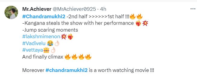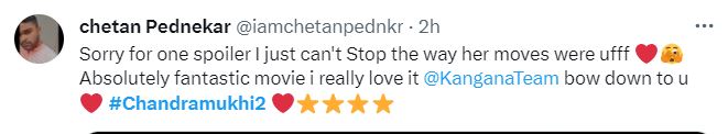 एक यूजर ने कमेंट करते हुए लिखा, "चंद्रमुखी का फर्स्ट हाफ और सेकंड हाफ दोनों ही फायर है। कंगना रनोट ने फिल्म में शानदार अभिनय किया है। मूवी में कई डरा देने वाले सीन हैं और क्लाइमेक्स तो बहुत ही शानदार है। चंद्रमुखी 2 आप देख सकते हैं"।