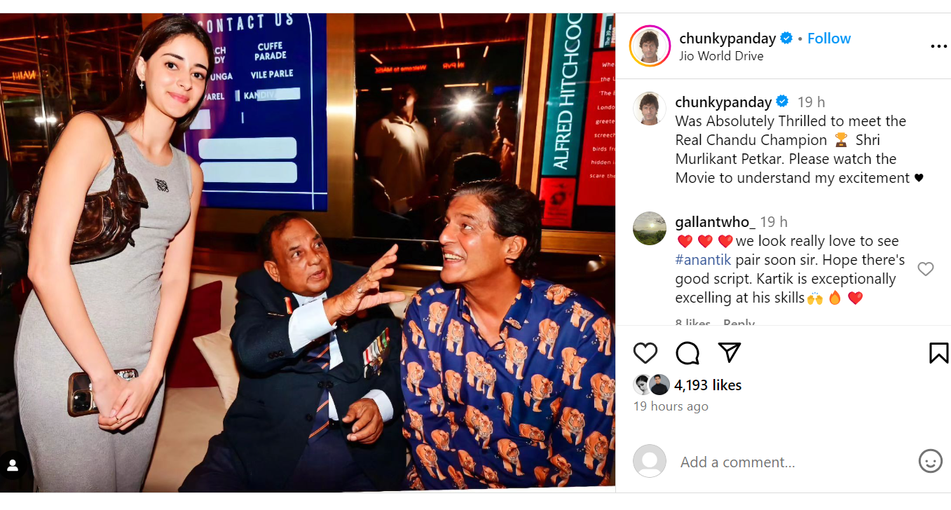 चंकी पांडे ने अपने सोशल मीडिया हैंडल इंस्टाग्राम पर एक पोस्ट शेयर किया है। इस पोस्ट में उन्होंने मुरलीकांत पेटकर के साथ 'चंदू चैम्पियन' की स्क्रीनिंग की एक तस्वीर शेयर की है, जिसमें अनन्या भी नजर आ रही हैं। एक्ट्रेस ग्रे ड्रेस में दिखाई दे रही हैं। इस फोटो को शेयर करते हुए उन्होंने कैप्शन में लिखा है कि असली चंदू चैम्पियन। मुरलीकांत पेटकर से मिलकर बहुत रोमांचित हुआ। प्लीज मेरी उत्सुकता को समझने के लिए फिल्म देखें।