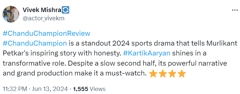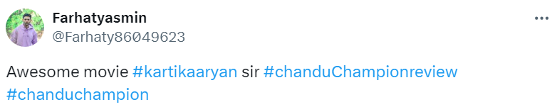 एक यूजर ने फिल्म को लेकर लिखा कि यह 2024 की बेहतरीन स्पोर्ट्स ड्रामा फिल्मों में से एक है, जो मुरलीकांत पेटकर की इंस्पायरिंग कहानी को ईमानदारी से बयां करती है। फिल्म में कार्तिक एक ट्रांसफॉर्मेटिव भूमिका में चमक रहे हैं। धीमे सेकंड हाफ के बावजूद, इसकी पावरफुल स्टोरी और शानदार प्रोडक्शन इसे जरूर देखने लायक बनाते हैं। वहीं, दूसरे यूजर ने फिल्म की तारीफ करते हुए इसे शानदार बताया।