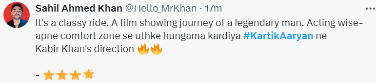 एक अन्य यूजर ने लिखा कि यह एक उत्तम दर्जे की राइड है, जो एक महान इंसान की यात्रा को दर्शाती है। एक्टिंग के लिहाज से अपने कम्फर्ट जोन से उठकर कार्तिक आर्यन ने हंगामा कर दिया। कबीर खान का निर्देशन बेहतरीन।