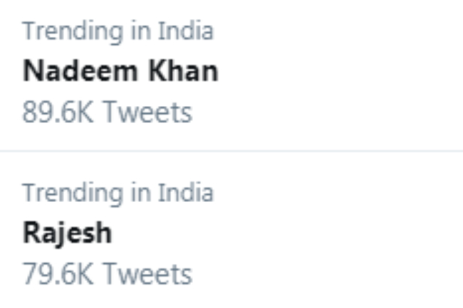 बुधवार को ट्विटर पर अचानक 'नदीम ख़ान' और 'राजेश' नाम ट्रेंड होने लगे। सोशल मीडिया ऐसे ट्वीट्स से भर गया, जिनमें विलेन के नाम को लेकर छपाक के मेकर्स को ट्रोल किया गया। शाम 7 बजे तक नदीम ख़ान को लेकर लगभग 90 हज़ार ट्वीट किये गये थे, जबकि राजेश को लेकर लगभग 80 हज़ार ट्लीट सर्कुलेट हो रहे थे।