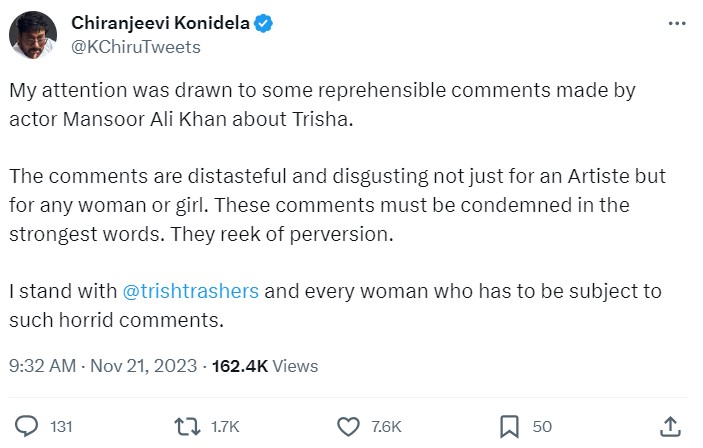 चिरंजीवी ने अपने आधिकारिक एक्स अकाउंट पर इस पूरे मामले को लेकर रिएक्ट किया है। सोशल मीडिया पर एक्टर, मंसूर अली खान पर हमलावर नजर आए। वहीं, तृषा का उन्होंने साथ दिया। चिरंजीवी ने कहा, "मेरा ध्यान अभिनेता मंसूर अली खान द्वारा तृषा के बारे में की गई कुछ निंदनीय टिप्पणियों पर गया।"