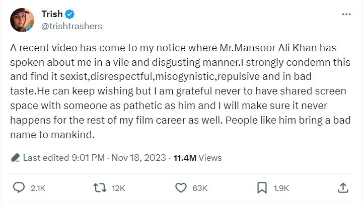 मंसूर अली खान के भद्दे कमेंट पर तृषा कृष्णन ने रिएक्ट किया था। गुस्सा जाहिर करते हुए एक्ट्रेस ने भविष्य में उनके साथ कभी भी काम न करने की बात कही। तृषा ने एक्स पर लिखा, "एक हालिया वीडियो ने मेरा ध्यान खींचा, जहां मिस्टर मंसूर अली खान ने मेरे बारे में भद्दे और घृणित तरीके से बात की है। मैं इसकी कड़ी निंदा करती हूं और इसे भेदभावपूर्ण, अपमानजनक, घृणित और खराब मानती हूं।"