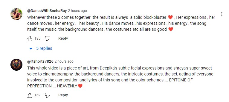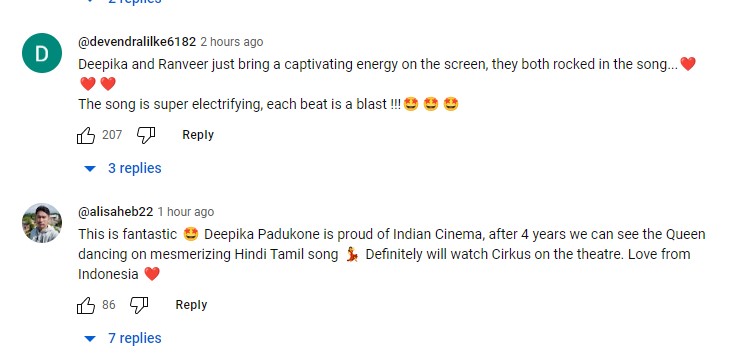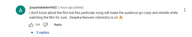 जहां किसी भी मौके पर रणवीर सिंह की एनर्जी दीपिका पादुकोण से हाई होती है, तो वही इस गाने में दीपिका की एनर्जी के सामने रणवीर सिंह भी फीके पड़े दिखाई दे रहे हैं। हालांकि दोनों की गाने में शानदार केमिस्ट्री ने सोशल मीडिया पर धमाल मचा दिया है। एक अन्य यूजर ने दोनों की केमिस्ट्री देखते हुए कहा, 'दीपिका और रणवीर जब साथ में आते हैं तो स्क्रीन पर एक एनर्जी आ जाती है। दोनों इस गाने में रॉक सॉलिड लग रहे हैं। ये गाना बिजली के करंट की तरह है, इसकी सभी बीट ब्लास्ट करने वाली हैं'। हाल ही में इस गाने का प्रमोशन भी हुआ, जिसमें दीपिका-रणवीर का रोमांटिक अंदाज देखने को मिला। दीपिका ने मंच पर रणवीर को किस किया।