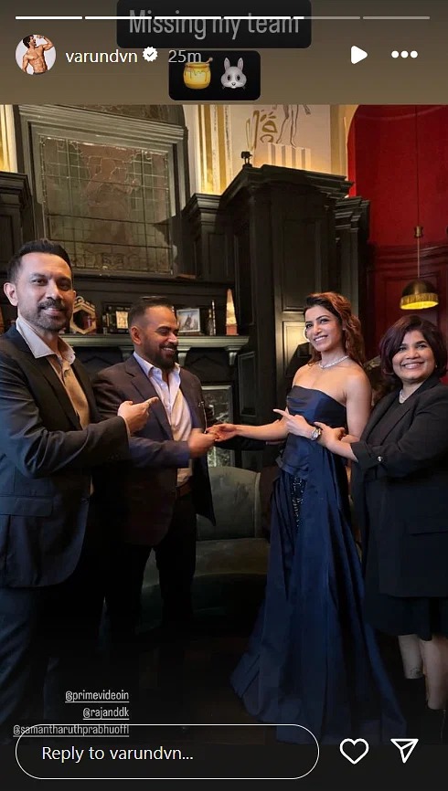 बता दें कि इस स्क्रीनिंग से मुख्य अभिनेता वरुण धवन कहीं गायब दिखे। हालांकि इंस्टा स्टोरी में उन्होंने मौके पर मौजूद ना होने का अफसोस जताया। सामंथा ने एक फोटो शेयर की थी जिसमें उन्होंने लिखा था कि वो अपने को स्टार वरुण को मिस कर रही हैं। वरुण ने वहीं फोटो अपनी इंस्टा स्टोरी पर शेयर करते हुए मिसिंग माई टीम लिखकर रिएक्ट किया। इसी के साथ उन्होंने हनी बनी का इमोजी भी बनाया।