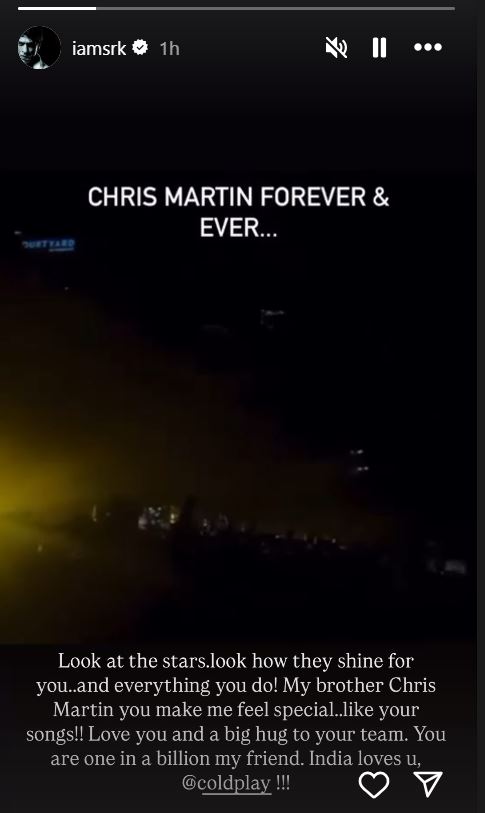शाहरुख खान ने वायरल वीडियो को अपने इंस्टाग्राम अकाउंट पर शेयर करते हुए लिखा, 'तारों को देखो…देखो कैसे वो आपके लिए चमक रहे हैं…और हर चीज जो आप करते हैं। मेरे भाई क्रिस मार्टिन अपने गानों की तरह ही आपने मुझे स्पेशल फील करवाया है। आपको प्यार और आपकी टीम को बड़ा सा हग। आप करोड़ों में एक हैं मेरे दोस्त। इंडिया आपसे प्यार करता है कोल्डप्ले।' वीडियो पर लिखा है, 'क्रिस मार्टिन फॉरएवर एंड एवर।' बता दें कि 19 जनवरी को कोल्डप्ले का दूसरा शो मुंबई में हुआ था जिसमें भारी संख्या में भीड़ क्रिस मार्टिन के गानों पर झूमने पहुंची थी।