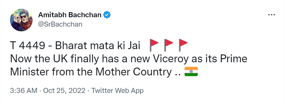 यह भी पढ़ें: Rishi Sunak के पीएम बनते ही अमिताभ बच्चन ने ब्रिटेन पर कसा तंज, लगाया 'भारत माता की जय' का नारा