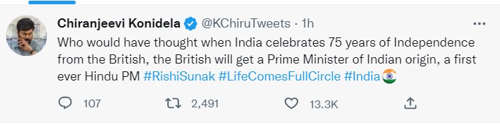 ऋषि सुनक के यूके के प्रधानमंत्री बनने की खुशी सिर्फ हिंदी सिनेमा में ही नहीं बल्कि साउथ में भी है। सुपरस्टार चिरंजीवी ने भी उनके लिए बधाई संदेश लिखा। चिरंजीवी ने कहा 'किसने सोचा होगा कि जब भारत देश अंग्रेजों से आजादी की 75वीं सालगिराह मना रहा होगा तब अंग्रेजों को ही भारतीय मूल का पहला हिंदू प्रधानमंत्री मिलेगा।' उन्होंने #RishiSunak #Lifecomesfullcircle #India का हैशटैग भी इस्तेमाल किया।