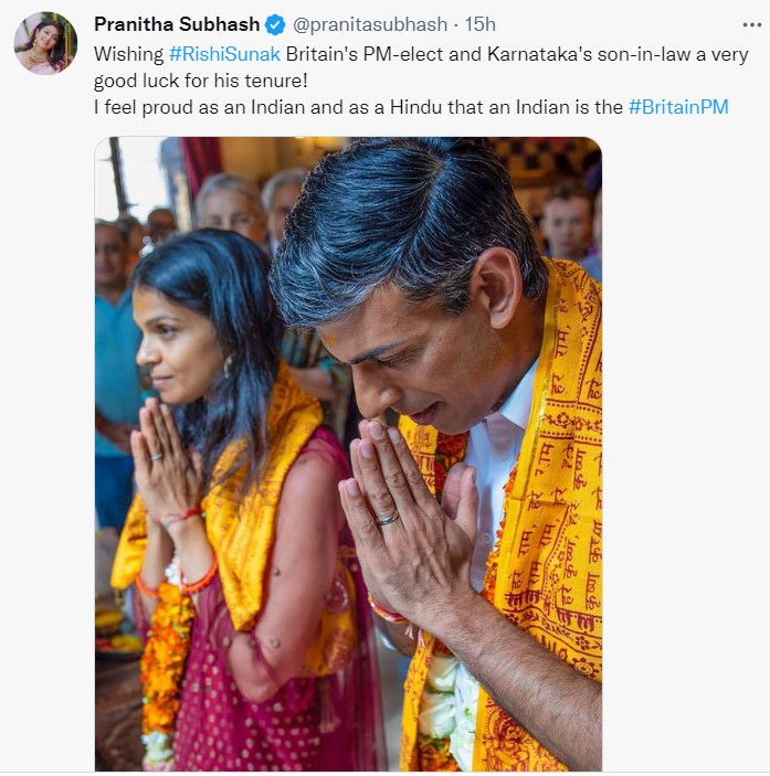 'हंगामा 2', 'डायनमाइट' जैसी फिल्मों में अभिनय कर चुकीं प्रणीता सुभाष ने भी ऋषि सुनक के लिए बधाई संदेश लिखा है। उन्होंने दो ट्वीट किए। एक में उन्होंने लिखा, 'गर्व महसूस हो रहा है कि एक भारतीय ब्रिटेन के प्रधानमंत्री बने। #RishiSunak आपने सभी भारतवासियों और हिंदुओं को गर्व महसूस करया है।'