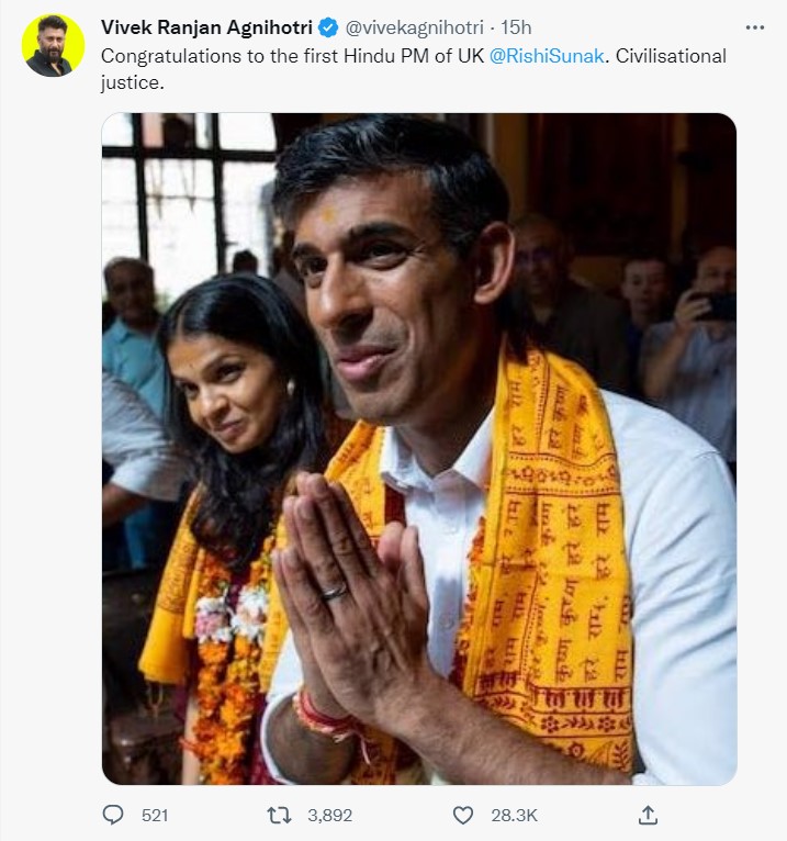 'कश्मीर फाइल्स' डायरेक्टर विवेक अग्निहोत्री भी ऋषि सुनक को बधाई देने से पीछे नहीं रहे। उन्होंने ऋषि की तस्वीर शेयर करते हुए लिखा, 'यूके के पहले हिंदू प्रधानमंत्री को बधाई। सभ्यतागत न्याय।'