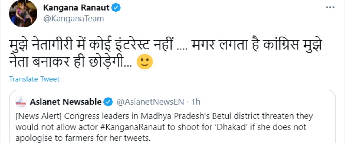 उधर, एक्ट्रेस ने भी ट्विटर के ज़रिए धमकी का जवाब दिया। कंगना ने लिखा- मुझे नेतागीरी में कोई दिलचस्पी नहीं। मगर, लगता है, कांग्रेस मुझे नेता बनाकर ही छोड़ेगी। कंगना ने शूटिंग शुरू होने से पहले मध्य प्रदेश के मुख्य मंत्री शिवराज चौहान से भी मुलाकात की थी।