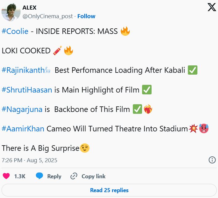 न्यूज 18 की एक खबर के मुताबिक, बीते दिन 8 अगस्त को कुछ गिने-चुने दर्शकों के लिए फिल्म की स्क्रीनिंग रखी गई थी, जिन्होंने मूवी देखने के बाद इसका डिटेल रिव्यू किया है। एक यूजर ने कुली की तारीफ करते हुए एक्स अकाउंट पर लिखा, "कुली-मास फिल्म है, जिसे लोकी ने बहुत अच्छे से भुनाया है। रजनीकांत की काबाली के बाद ये बेस्ट परफॉर्मेंस है। श्रुति हासन फिल्म की मुख्य हाइलाइट हैं। नागार्जुन फिल्म की बैकबोन हैं और आमिर खान ने तो थिएटर को स्टेडियम ही बना दिया है। फिल्म में आप सबके लिए एक सरप्राइज है।