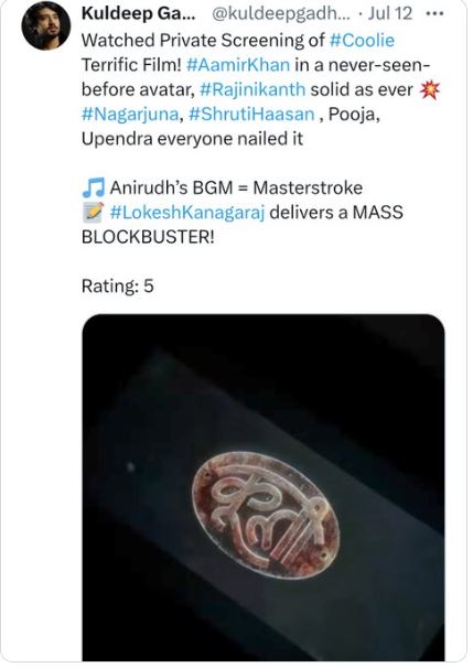 एक कुलदीप नामक शख्स ने तो रजनीकांत और आमिर खान स्टारर फिल्म को 5 में से 5 स्टार देते हुए लिखा, "कुली की प्राइवेट स्क्रीनिंग के दौरान फिल्म देखी। शानदार फिल्म है। आमिर खान को ऐसे अवतार में आपने पहले कभी नहीं देखा होगा। रजनीकांत हमेशा की तरह सॉलिड लगे हैं। नागार्जुन, पूजा हेगड़े और उपेंद्र सभी ने अपनी परफॉर्मेंस से दिल जीत लिया है। अनिरुद्ध का बैक ग्राउंड म्यूजिक फिल्म का मास्टर स्ट्रोक है। ये एक मास ब्लॉकबस्टर फिल्म है"।