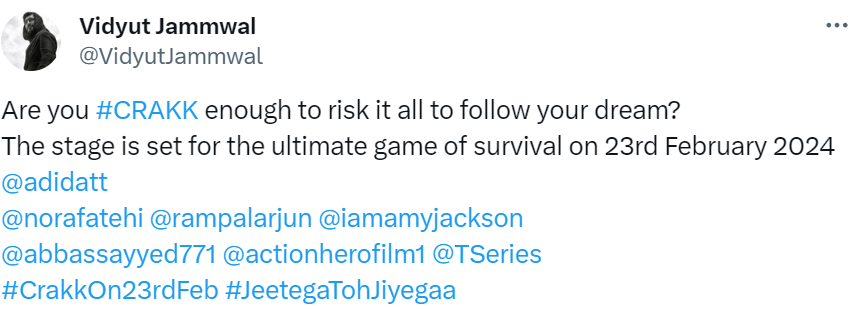 इस फिल्म में विद्युत जामवाल के अलावा अर्जुन रामपाल, नोरा फतेही और एमी जैक्सन भी मुख्य भूमिकाओं में हैं। इस पोस्ट को शेयर करते हुए विद्युत ने लिखा 'क्या आप इतने CRAKK हैं कि अपने सपने को पूरा करने के लिए सब कुछ जोखिम में डाल सकते हैं? 23 फरवरी 2024 को अस्तित्व के अंतिम खेल के लिए मंच बिल्कुल तैयार है'।