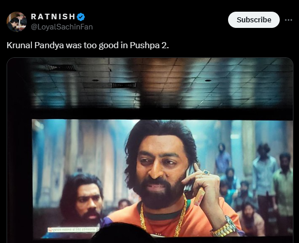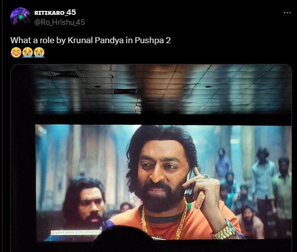 सोशल मीडिया पर यूजर ने तारक पोनप्पा की 'बुग्गा' के किरदार में एक फोटो शेयर करते हुए लिखा, "पुष्पा 2 में क्रुनाल पांड्या ने क्या किरदार निभाया है"।