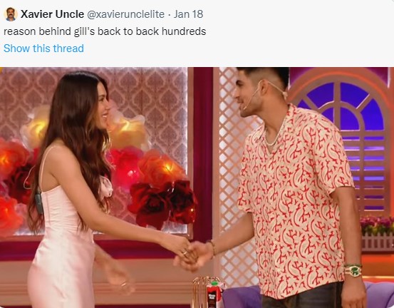 आपको बता दें कि शुभमन कुछ महीने पहले ही में सोनम बाजवा के शो में पहुंचे थे। जहां क्रिकेटर से पंजाबी एक्ट्रेस ने सारा अली खान संग उनके इक्वेशन के बारे में पूछा था। सारा को डेट करने को लेकर शुभमन गिल को लेकर 'शायद' में जवाब दिया। इसके बाद सोनम ने उन्हें टीज करते हुए कहा, 'सारा दा सारा सच बोलो प्लीज'।