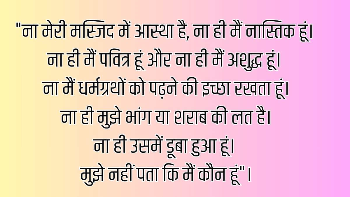 बुल्ले शाह की इस कविता के बोल थे, "ना मैं मोमन विच मसीतां, ना मैं विच कुफर दीआं रीतां,ना मैं पाका विच पलीता, नाम मैं मूसा ना फरऔन, ना मैं अंदर वेद किताब, ना विच भांग-शराब, ना विच रिंदा, मस्त खराबा, ना विच जागन ना विच सौन...बुल्ला की जाणा मैं कौण..." पंजाबी में इस कविता का मतलब आपको अंदर तक झकझोर देगा और आप से पूछने पर मजबूर हो जाएंगे कि मैं कौन हूं"।