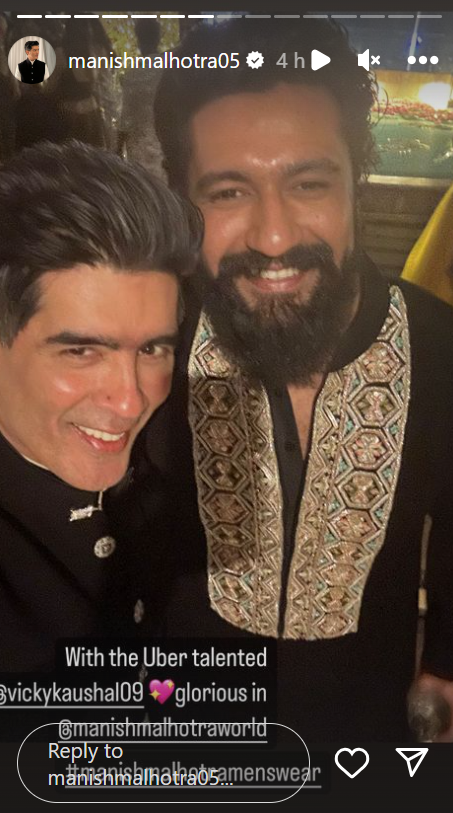 10 नवंबर को निर्माता अमृतपाल सिंह ने दिवाली पार्टी का आयोजन किया। इस पार्टी की कई फोटोज मनीष मल्होत्रा ने अपनी इंस्टाग्राम स्टोरी पर शेयर की हैं। पहली फोटो में मनीष, विक्की कौशल के साथ पोज देते हुए नजर आ रहे हैं। इस फोटो में मनीष जहां ब्लैक सूट पहने हुए दिखाई दे रहे हैं। वहीं, विक्की कौशल भी मनीष मल्होत्रा का डिजाइन किया हुआ ब्लैक कुर्ता पहने हुए दिखाई दे रहे हैं।